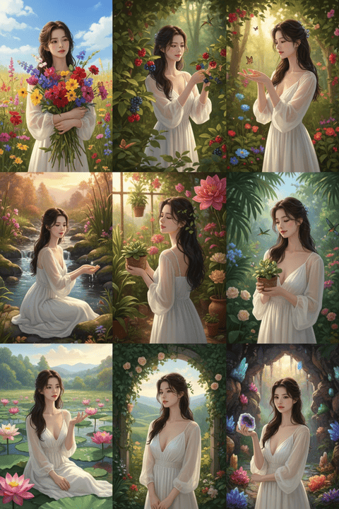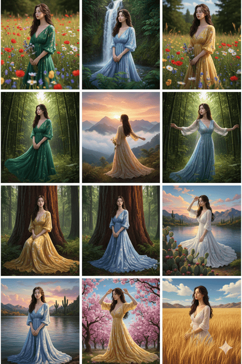 Using the uploaded photo as a reference, generate a set of 9 vibrant half-length portraits featuring natural life. Each portrait should show a different pose and be placed in a unique setting, with rich, colorful details that highlight the diversity of nature.