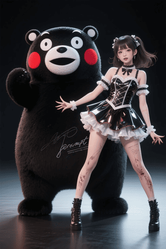 { “prompt”: “masterpiece, best quality, 8k, highly detailed, 1girl, j-pop idol, cute, energetic, wearing concert stage costume, frills, shiny clothes, (kumamon:1.3), huge, 3d render, mascot, black bear, red cheeks, standing next to girl, simple studio background, dark background, rim lighting, dramatic lighting, backlight, volumetric lighting, contours, sharp focus”, “negative_prompt”: “low quality, worst quality, bad anatomy, bad hands, missing fingers, extra digits, text, watermark, signature, blurry, jpeg artifacts, cropped, ugly, distorted face, mutation, deformed”, “steps”: 30, “cfg_scale”: 7.0, “width”: 512, “height”: 768, “sampler_name”: “DPM++ 2M Karras”, “seed”: -1 }