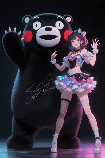 “prompt”: “masterpiece, best quality, anime, anime style, cel shading, vibrant colors, 1girl, j-pop idol, cute, energetic, wearing concert stage costume, frills, sparkling clothes, (kumamon:1.3), huge, 3d render, mascot, black bear, red cheeks, standing next to girl, simple studio background, dark background, intense rim lighting, dramatic lighting, backlight, volumetric lighting, contours, sharp focus”,