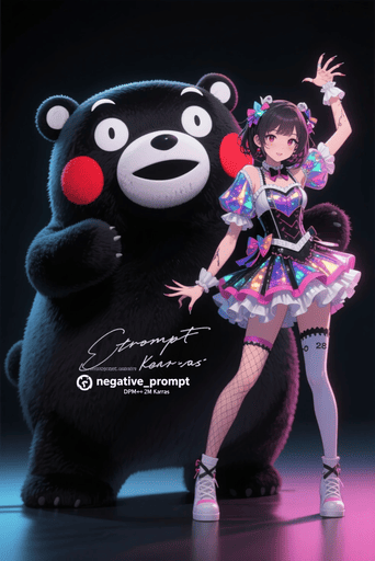 { “prompt”: “masterpiece, best quality, anime, anime style, cel shading, vibrant colors, 1girl, j-pop idol, cute, energetic, wearing concert stage costume, frills, sparkling clothes, (kumamon:1.3), huge, 3d render, mascot, black bear, red cheeks, standing next to girl, simple studio background, dark background, intense rim lighting, dramatic lighting, backlight, volumetric lighting, contours, sharp focus”, “negative_prompt”: “low quality, worst quality, bad anatomy, bad hands, missing fingers, extra digits, text, watermark, signature, blurry, jpeg artifacts, cropped, ugly, distorted face, mutation, deformed, photorealistic, realistic, 3d reality”, “steps”: 28, “cfg_scale”: 7.5, “width”: 512, “height”: 768, “sampler_name”: “DPM++ 2M Karras”, “seed”: -1 }