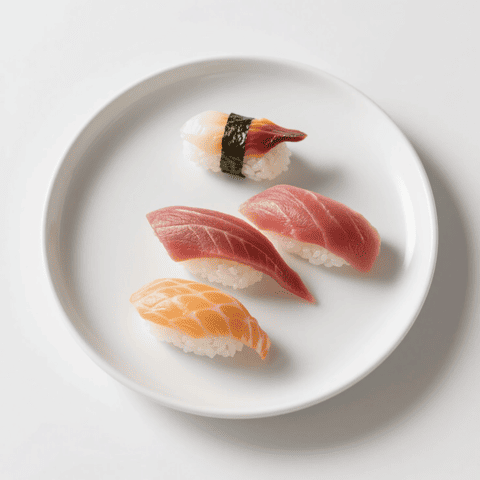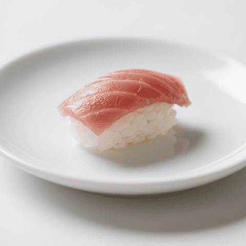 single plate of sushi, tuna nigiri sushi (1.1), glossy fresh tuna, white sushi rice (1.0),