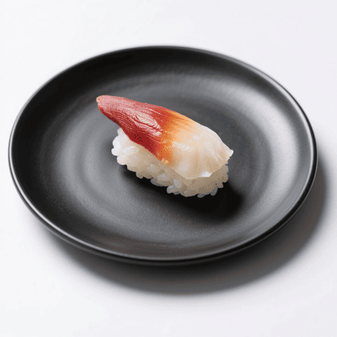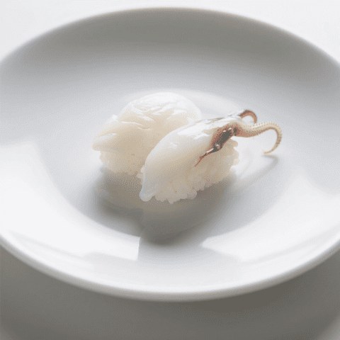 single plate of sushi, squid nigiri sushi (1.1), ika sushi, translucent white squid,