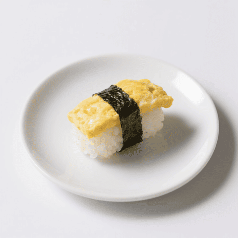 single plate of sushi, tamago nigiri sushi (1.1), sweet omelette sushi, yellow tamago,