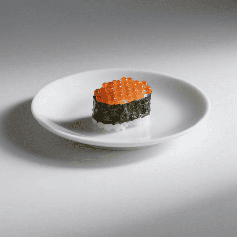 single plate of sushi, salmon roe gunkan sushi (1.1), ikura, glossy orange salmon roe,