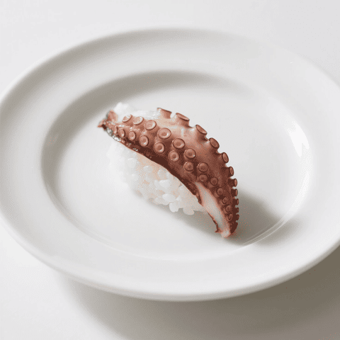 single plate of sushi, octopus nigiri sushi (1.1), tako sushi, sliced octopus with suction cups,