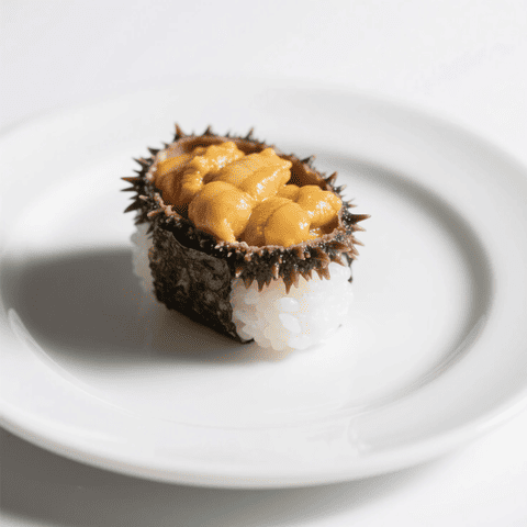 single plate of sushi, sea urchin gunkan sushi (1.1), fresh uni, golden yellow sea urchin,