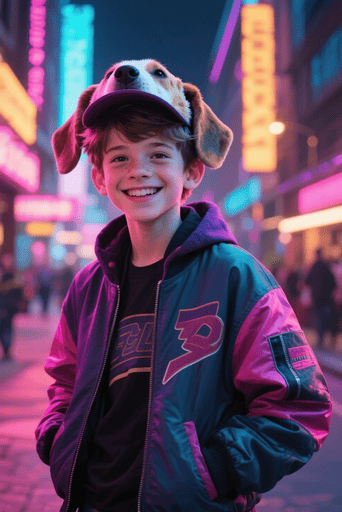 realistic teenage boy (1.1), dog animal cap (1.2), smiling,
