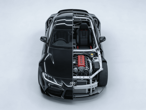 この車の断面図を作成し、一方の側面には完全な外部構造を表示し、もう一方には内部のエンジンと座席を表示する。