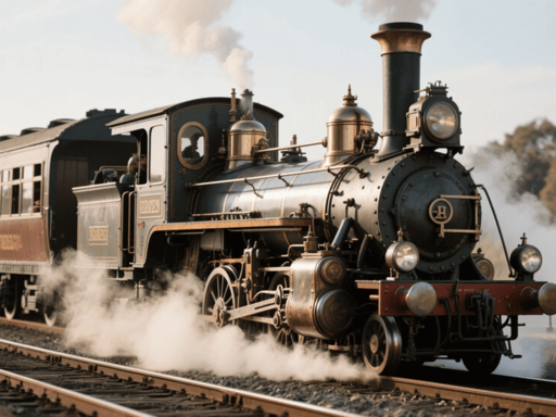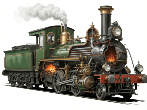 この蒸気機関車の断面図を作成し、一方の側面には完全な外部構造を表示し、もう一方には内部のエンジンなどの機構を表示する。