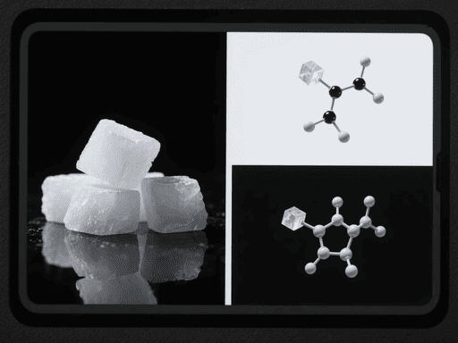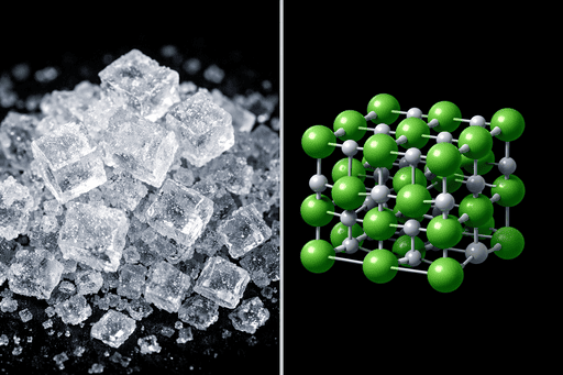 画面を2分割する。一方には食塩の結晶の画像をもう一方には食塩の分子モデル図を生成する。背景は黒