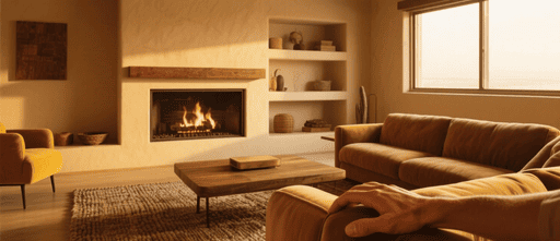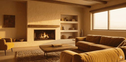 洋風のモダンな居間、暖炉、ソファ