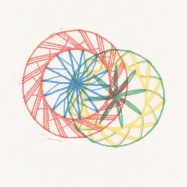 スピログラフは、歯車状のリングと円盤パーツを組み合わせ、ペンで回転させて美しい幾何学模様(内トロコイド曲線)を描く定規セットです。1965年にイギリスで発明され、子供から大人まで遊べる「くるくる定規」として世界的に有名。現在も100円ショップや玩具店、アプリ等で入手可能。