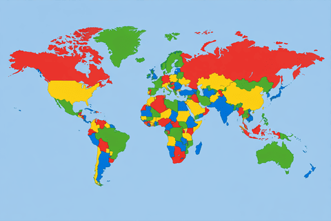 世界地図を隣り合う色が同じ色にならないように4色で塗り分けなさい。