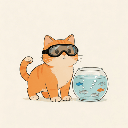 水泳用ゴーグルをつけたオレンジ色の猫が、泡と小魚の入った透明な水槽の横で片足を上げている。きれいな日本のフラットイラスト、新鮮なカラーパレット、一貫した線の太さ、十分な余白(ネガティブスペース)、中央配置の構図、高いコントラストだがきつくない。写実的ではない。テキストなし。