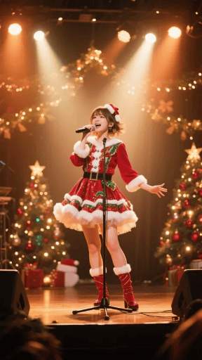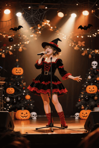 女性の衣装をハロウィンの衣装にしてください。画像全体をクリスマスからハロウィンの装飾に変えてください。
