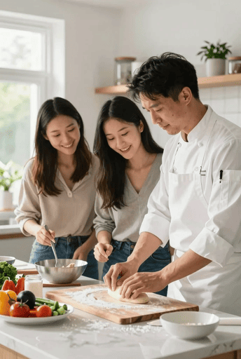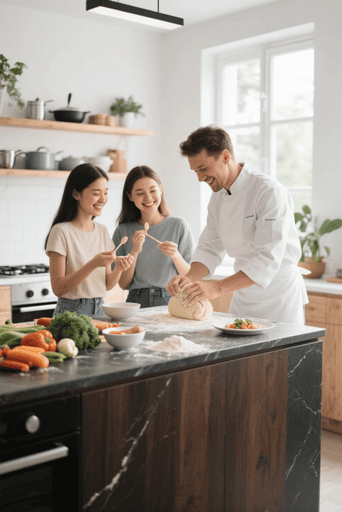 A high-definition, photorealistic candid shot taken mid-afternoon in a brightly lit, modern island kitchen studio. The scene depicts a warm and engaging cooking lesson. A professional chef (the instructor), wearing a clean chef’s white apron, is demonstrating a precise culinary technique, perhaps intricately kneading dough or elegantly plating an artisanal dish. His hands are focused on the task, showing the texture of the ingredients. Standing close to him are two young women in their early twenties, looking intently and eagerly at his hands, smiling and focused. They are learning and engaged, perhaps holding spoons or bowls. All are dressed casually yet neatly. Natural light streams in from a large window off to the side, illuminating the scene and casting soft, gentle shadows. The lighting is white and airy, creating a fresh, clean, and warm atmosphere. The focus is sharp on the faces, expressions, and the action happening in their hands on the dark wood or sleek marble kitchen island, which is immaculate with scattered fresh, colorful ingredients (vegetables, flour). The background is slightly blurred (bokeh effect), showing a modern, minimal, white and light wood kitchen setting with neat shelves holding cookware and plants, emphasizing the subjects. The composition is a medium shot, shot from a natural side angle at eye level, capturing the three individuals and their interaction with the cooking area. The texture of their clothing, the food, and the kitchen surfaces are highly detailed. Shot on a Canon EOS R5 with a 35mm lens, f/2.8, 1/160s, ISO 400.