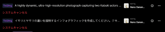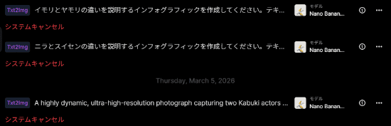昨日、2026.03.04にSeaArtのアップデートがありました。その後、Nano Banana 2はシステムキャンセルが多発しました。今回の画像を4枚生成するために、かなりのシステムキャンセルにあってしまいました。下の画像は、一部であり実際はシステムキャンセルがもっとありました。