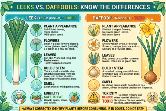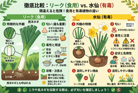 ニラとスイセンの違いを説明するインフォグラフィックを作成してください。テキストはすべて正しい日本語表記にしてください。