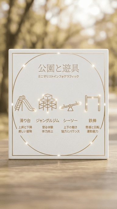 公園・インフォグラフィック、ミニマリスト・インフォグラフィック、マットな白セラミック素材、シャンパンゴールドの金属ラインのアクセント、エンボスまたは金箔形式のテキスト、柔らかい拡散光、黄金比の構図、8K 解像度、最高傑作の品質。Unique text content: 滑り台、ジャングルジム、シーソー、鉄棒。テキストはすべて正しい日本語表記にしてください。