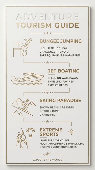 アドベンチャー・ツーリズム・インフォグラフィック、ミニマリスト・インフォグラフィック、マットな白セラミック素材、シャンパンゴールドの金属ラインのアクセント、エンボスまたは金箔形式のテキスト、柔らかい拡散光、黄金比の構図、8K 解像度、最高傑作の品質。Unique text content: Bungee Jumping, Jet Boating, Skiing Paradise, Extreme Sports –ar 9:16